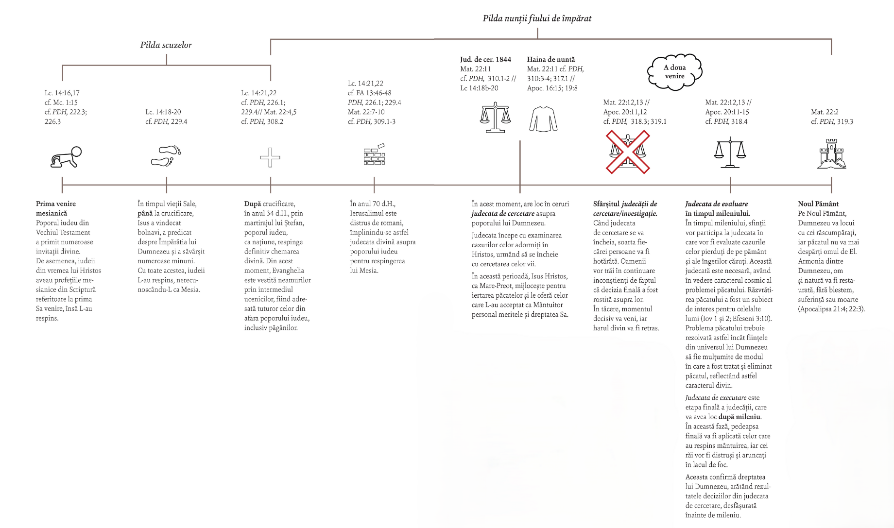 - Schița „Chemarea divină și răspunsul nostru” prezintă în mod cronologic interpretarea și identificarea istorică a „Pildei scuzelor” și a „Nunții fiului de împărat”. Pentru a urmări această cronologie, trebuie să se țină cont de următoarele aspecte: (1) în partea superioară se regăsesc referințele biblice și cele din scrierile lui Ellen G. White care susțin interpretarea; (2) în partea inferioară sunt prezentate informațiile privind interpretarea istorică a versetelor indicate în partea superioară. Referințele din scrierile lui Ellen G. White sunt preluate accesând următoarele două linkuri: https://beta.egwwritings.org/read?panels=p2673.910&index=0 și https://beta.egwwritings.org/read?panels=p2673.1327&index=0.